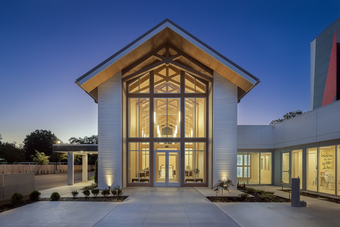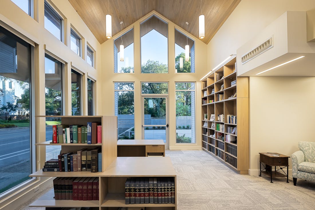 The Third Church of Christ Scientist reimagined its space to align with its core principles and support future growth. Located near Highland Row and the University of Memphis, the new sanctuary contributes to East Buntyn’s revitalization while balancing two distinct zoning contexts—urban density and residential neighborhoods. Designed as a campus-like environment, the minimalist structure replaces an inefficient, oversized building with a flexible, multi-use space that maximizes natural light and energy efficiency. Floor-to-ceiling windows enhance transparency, while deep eaves provide daylighting and privacy. By integrating biophilic design and respecting zoning parameters, the new church fosters a strong connection between historic values, modern community needs, and the evolving Highland Strip corridor.