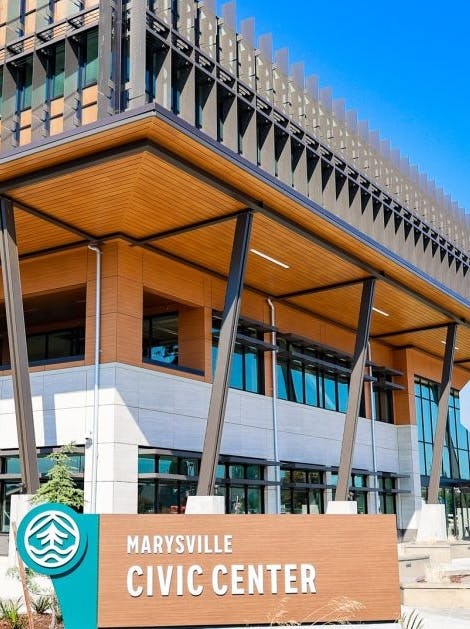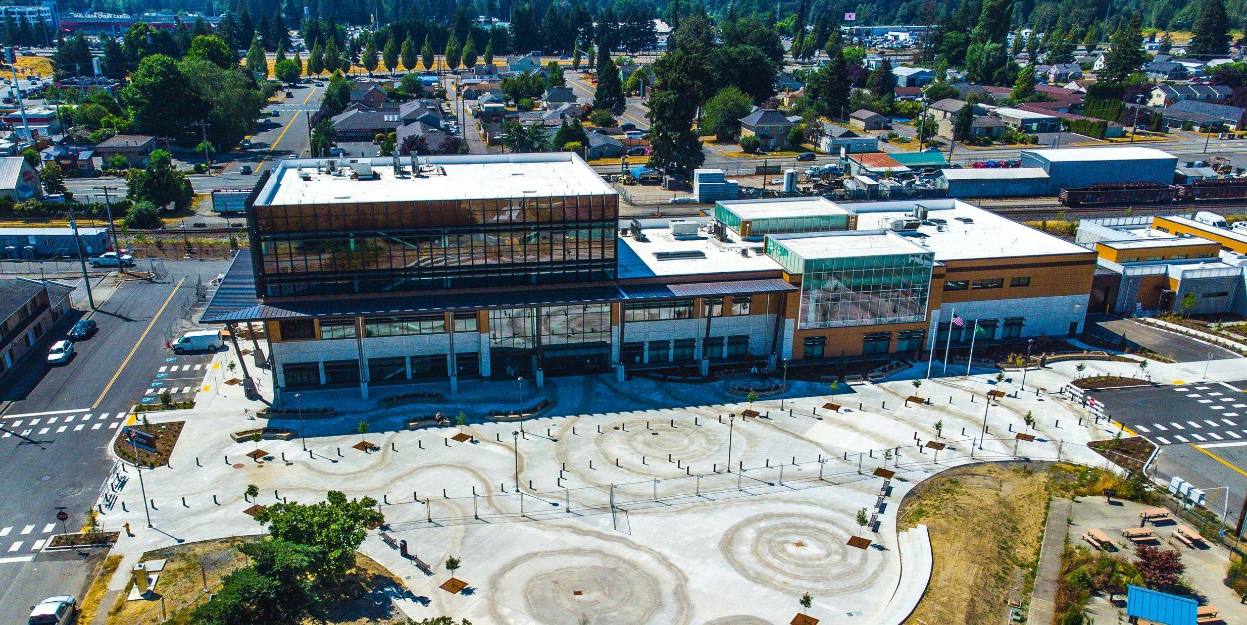 Our team provided civil engineering design services in support of the new Marysville Civic Center located in Marysville, WA. This $53.7 million, 101,000 SF facility was designed as a "one-stop shop" for city services and houses the police station, jail, municipal court, city council chambers, city hall, community development, and public works offices. The center brings many of the city's services into one modern, energy-efficient facility with a connecting courtyard space. We also provided civil engineering design services for upgrades to the adjoining Comeford Park. These upgrades included new restrooms, a public plaza and amphitheater seating, lighting, walkways, and landscaping.