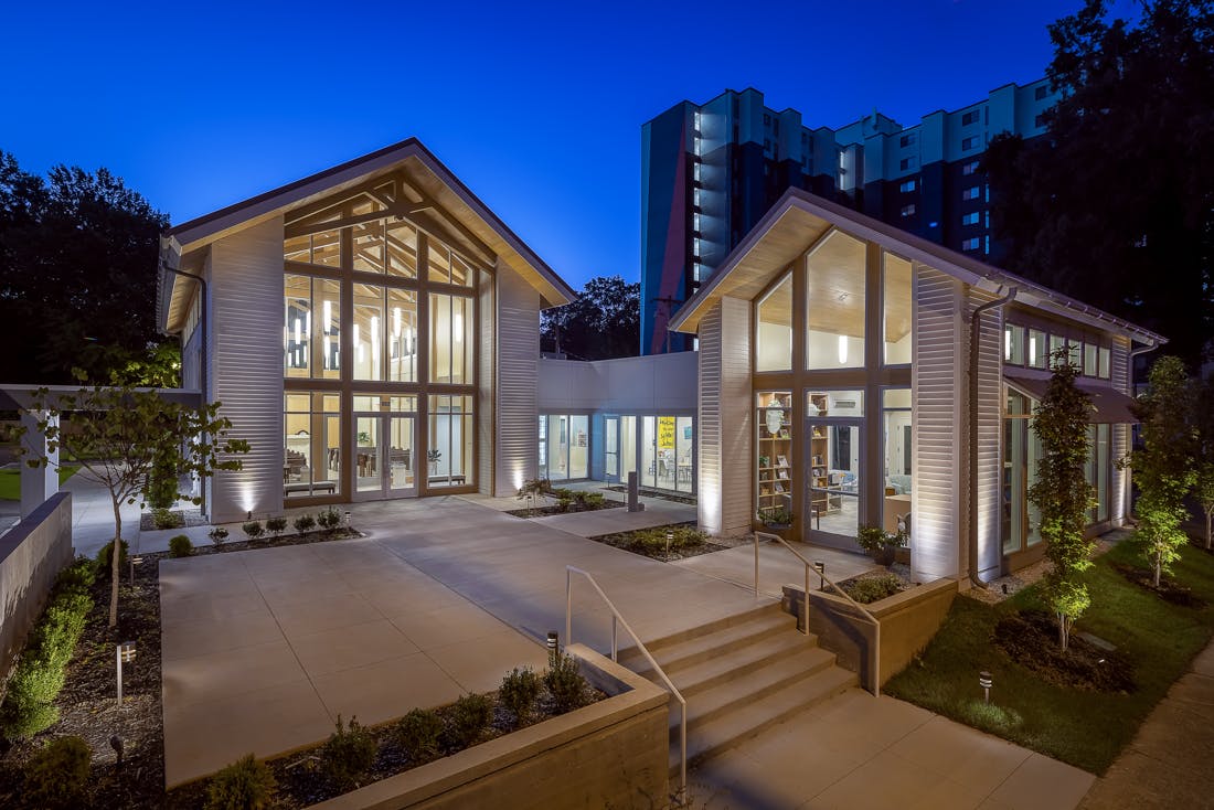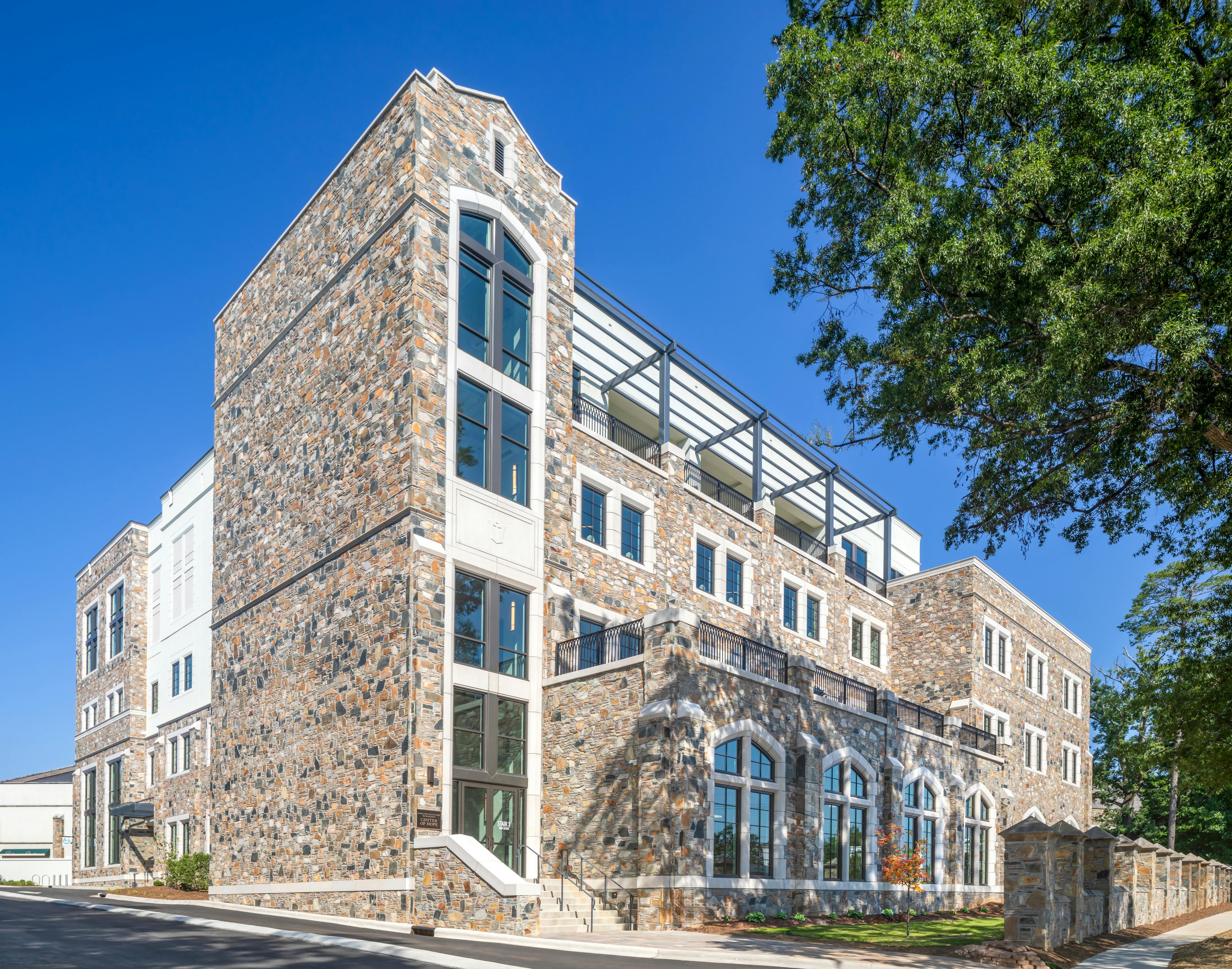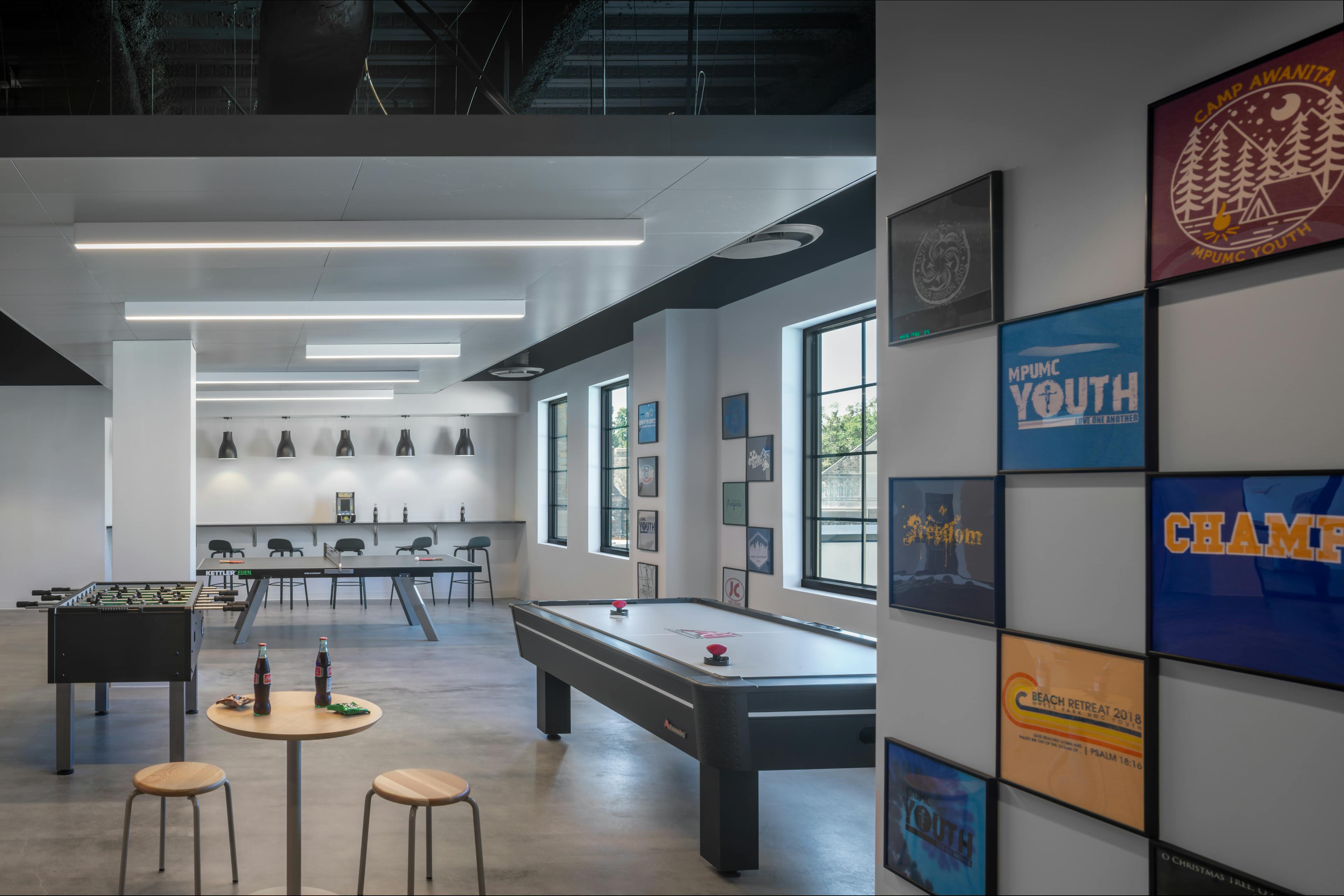 The church’s new 5-level building prioritizes Youth Ministry with dedicated spaces on the second and third floors, featuring gaming consoles, tabletop games, an art room, and classrooms. A stairatorium connects these floors, encouraging interaction. The lobby includes a mission-focused café overlooking a multi-purpose gymnasium, and the lower level has a Hospitality Suite for the Room in the Inn ministry and visiting youth groups. The fourth floor houses an Assembly Hall with state-of-the-art AV technology and a gallery for local artists. Original artwork, including youth-created murals, is displayed throughout. Outdoor terraces on the second and fourth floors offer seating and views of Uptown Charlotte. The columbarium outside was renovated to increase capacity and enhance accessibility.