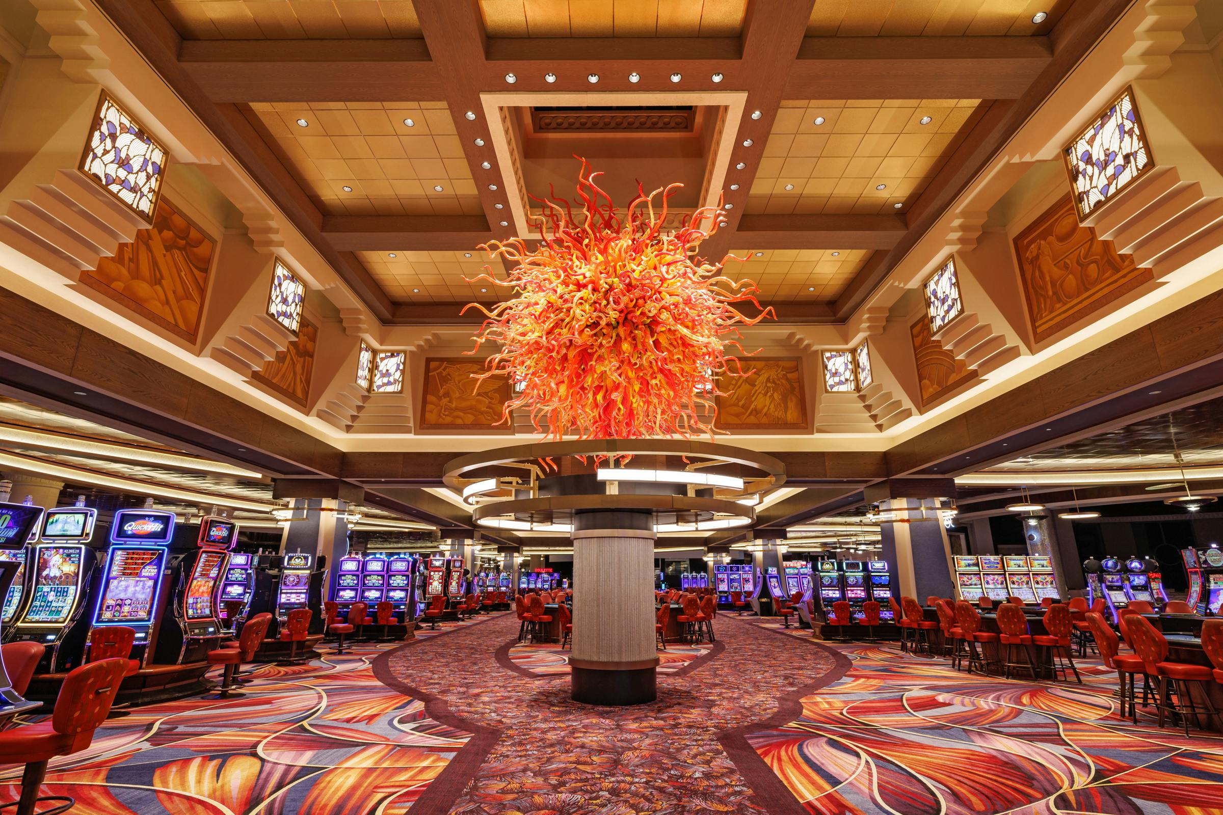 Ribbon Town is the Pokagon Band's historic name for South Bend, a heritage celebrated in the river patterning and vivid sunset colors of the new Ribbon Town Conference and Events Center at Four Winds South Bend Casino & Hotel. Guests ascend to the second-floor conference and events center via a central cluster of escalators and stairs that transport guests upward into a vibrant entry experience. Emphasized by a vaulted ceiling, the dramatic cove lighting wrapped in large copper ring ceiling accents frames an enchanting chandelier of suspended copper, champagne and silver colored metal shapes reminiscent of lily pads in the river.Mimicking a sunset’s reflection on rippling water, the multi-purpose event center features warm amber, gold, and deep violet hues in lighting fixtures, furnishings, and in the custom carpeting’s abstracted river pattern. Elegant wood detailing, neutral accents, and copper wall and column accent trim add just the right additional touches to enhance the high-end aesthetic for appeal to guests attending a wide range of event types.