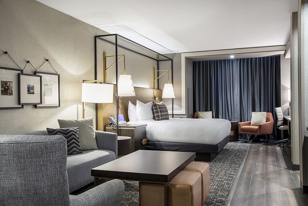 Perched along the banks of the Mississippi River, Hyatt Centric Beale Street is a 227 room hotel and conference center nestled within a vibrant neighborhood known for its historic music entertainment district, historic landmarks and southern hospitality. Located at the intersection of music history on Beale Street, Memphis industrial history on Front Street and the Mississippi River, the Centric property is influenced by the unique juxtaposition of ideas and concepts related to a site which influenced the design. The musically inspired ideas of flow, pitch, meter, rhythm, sound, repetition, vibration, and resonance are found throughout the design. The original 1878 Ellis Machine Shop buildings were repurposed for the hotel’s event, conference, and meeting space. Designers honored the inimitable history of the former blacksmith shop by integrating the structures into the overall property and referencing the building and its original use throughout the hotel’s interior design and detailing. The Beck and Call lounge provides a 360-degree view of the city and river from the rooftop. The design emotes pure Southern spirit inspired by the amber color of whiskey, glass whiskey bottles and whiskey barrels.