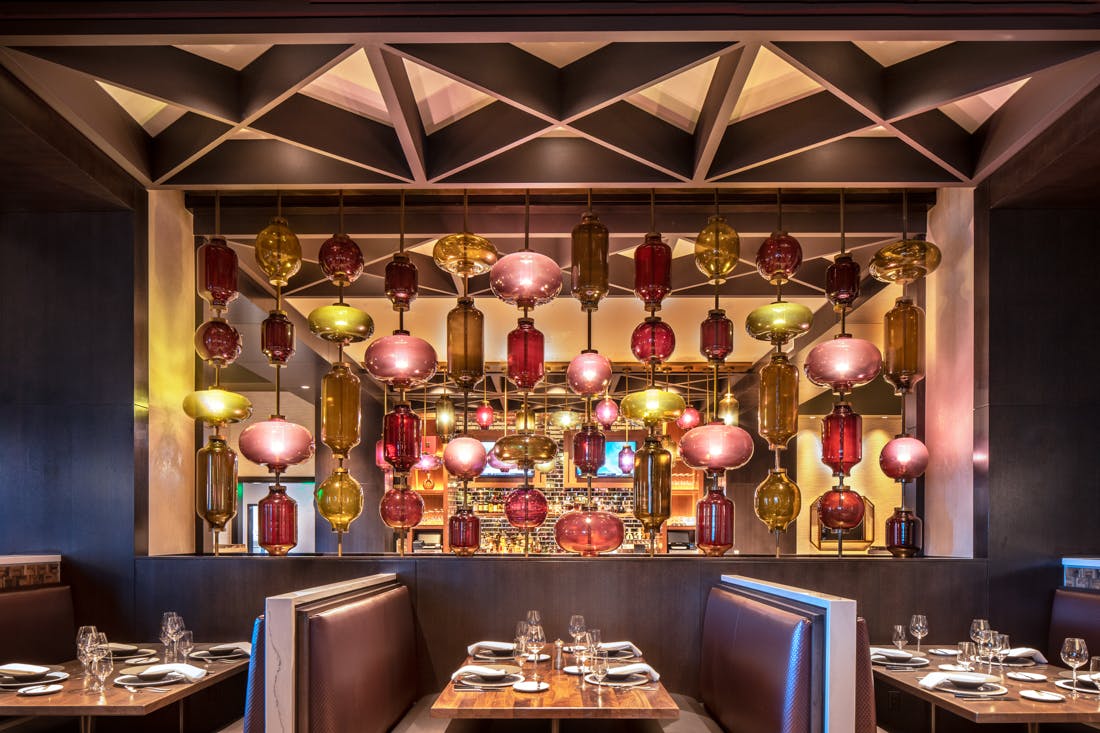 The Oak Room at Historic Oaklawn Racing Resort is a perfect blending of contemporary and traditional design. The eclectic eatery recalls a dimly lit, moody vintage parlor with deep colored tones, oak wood and black marble finishings. Paneled walls, hand rubbed antique brass detailing, antiqued mirrored columns, and textured wallcoverings contrast with contemporary elements. Custom furnishings feature a high-quality layering of ikat, plaid, flame stitch, velvet, and leather fabrics.