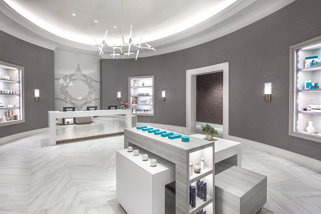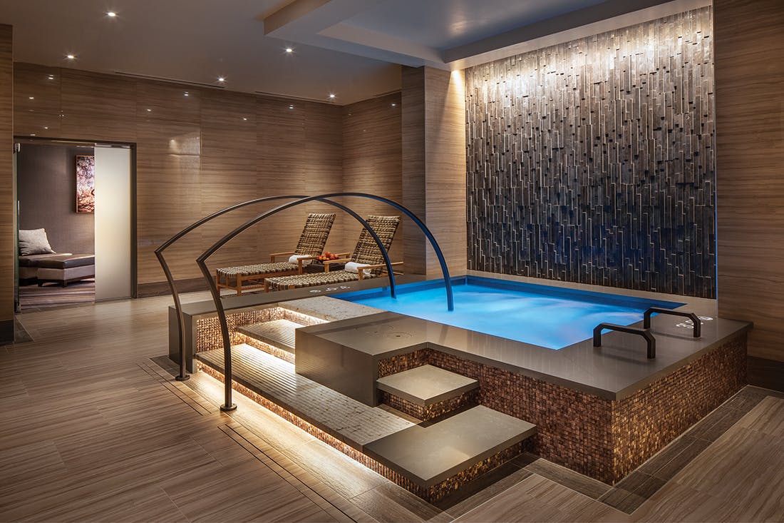 Offering a high-end, elegant residential feel and comfort, guests can relax and be pampered in the 12,000 SF Cache Creek Spa featuring 11 treatment rooms, a full-service salon, and separate men’s and women’s lounges and aqua-thermal areas featuring whirlpools, steam rooms, saunas and cooling showers. Drawing abundant inspiration from the surrounding agrarian landscape of the valley and the river, the design elegantly welcomes guests to the full-services spa experience with a rejuvenating palette of French Gray, lavender and neutral tones, organic textures, a Himalayan salt wall to calm the senses, and whimsical lighting elements designed to enchant. A focal point in the ladies’ spa area is a custom floral-motif mosaic tile wall derived from a watercolor piece by local San Francisco Bay area artist, Jen Garrido. Commissioned photography of the Capay Valley is featured throughout to create cohesion with the resort and awareness of the spa environment as a distinctive place of retreat and escapism. Photography by Peter Malinowski